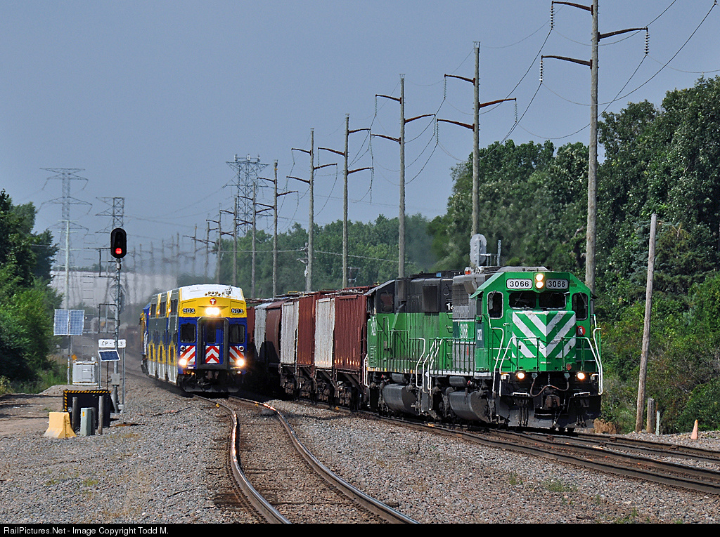 Northstar 603 comes screaming into the Fridley station as a SD40-2 leads a mixed freight along and into the BNSF Northtown yard a few miles up the line.