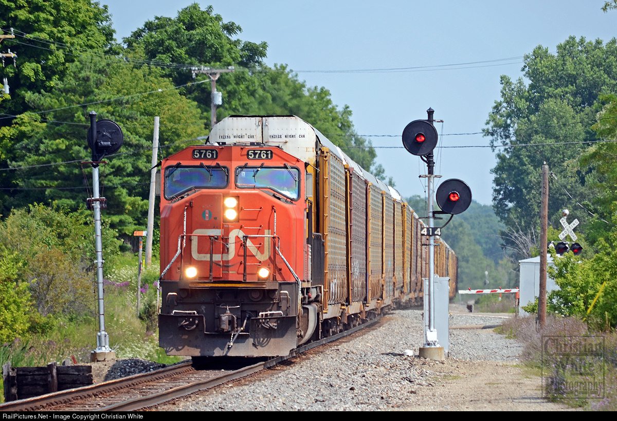 Today's M371 cruises past the 414 and 415 searchlight signals in Davisburg, MI. The 414 signal was once the distance signal to, the now out-of-service, Andersonville siding. There once were five sidings between Durand and Pontiac; but as automotive traffic dwindled and trains grew longer, many of these sidings became useless. Today, only two sidings remain on the Holly Subdivision between Pontiac and Durand.
