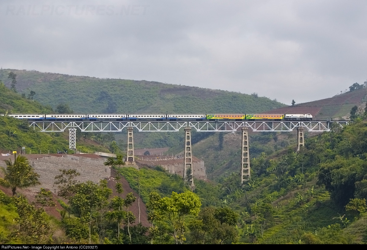 | CC20417 leads the Malabar Express, passing Citiis Bridge. The Train Routes is Malang to Bandung,VV. |