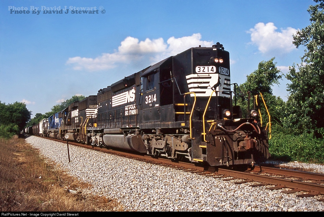 | NS NÂș 3214 was still a high nosed, loud and proud SD40-2 in the summer of 2004 and is seen leading a NS GP60 and a former CR SD50 on NS train 347. 3214 was side lined in April of 2013, it returned to service as a low nose Admiral Cab SD40-2 in February of this year, 2014. -slide scan |