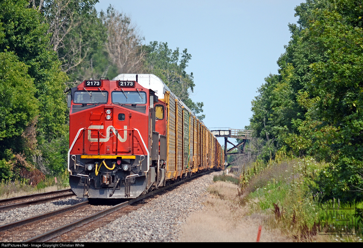 | CN 2173 is in charge of M371, consisting of brand new Ford F150s and Mustangs. Here, M371 holds on main two for L502 to come off the single track. |