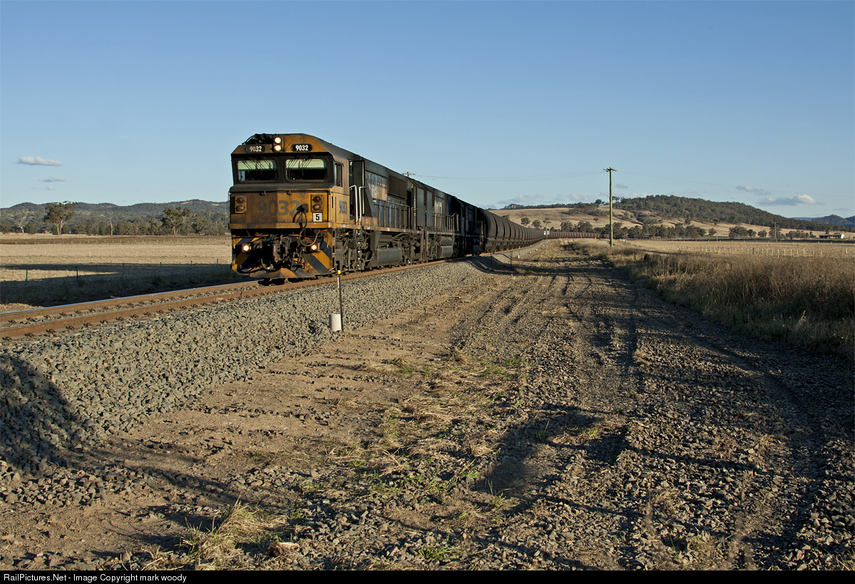 Late afternoon winter sun lights 9032-9017-9023 working an empty coal train west to load, the valley has lost its lovely green paddocks and farmers since being bought by coal mining companies.