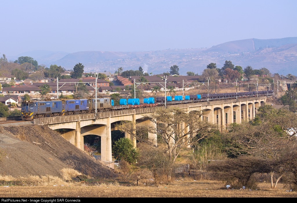 | Just after a very hazy winter sunrise (we need rain badly), as Class 18E Series 1, 18-008, heads this Durban bound train with a load of export steel coils across the Pentrich Viaduct in a very dry Pietermaritzburg. |