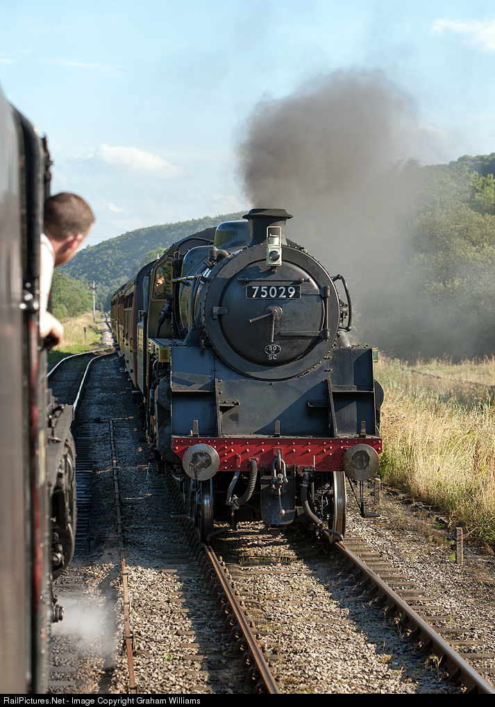 | BR Standard no 75029 comes off the single line section on the North Yorkshire Moors Railway to clear it for our train headed by Black Five no 44806. |