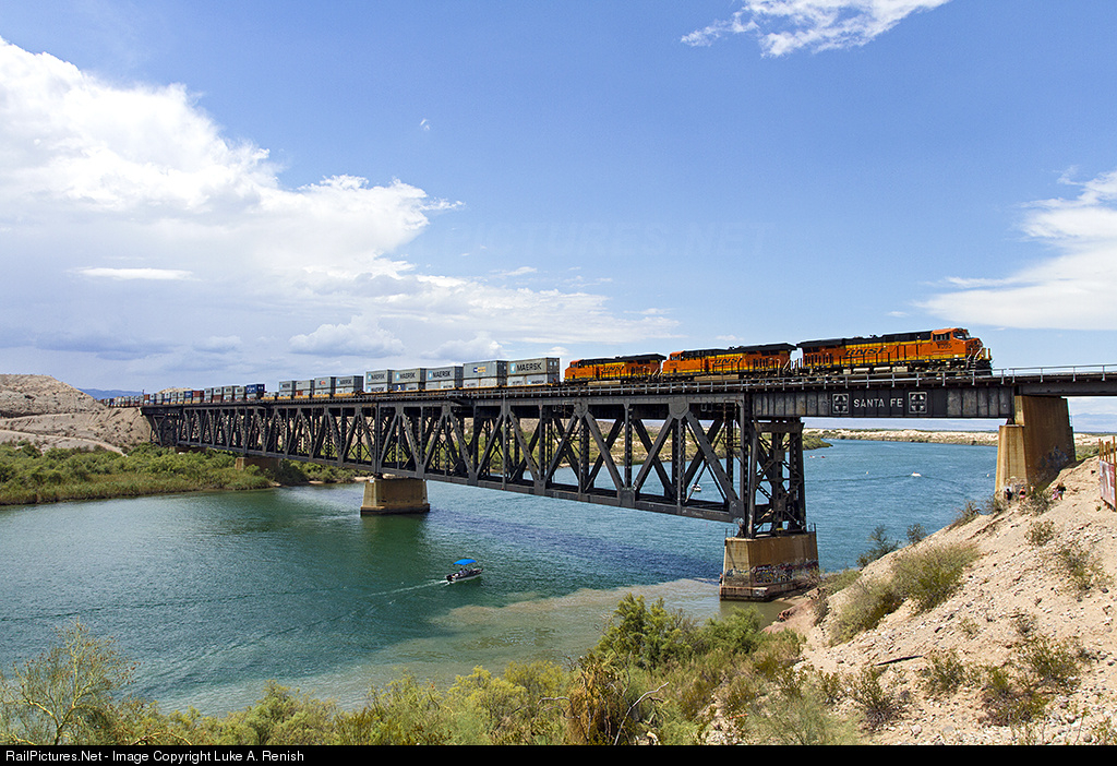 | With summer monsoons threatening to the east and west, BNSF 7095 races east across the California/Arizonia River at Topock in the last sunny skies it'll see for miles. |