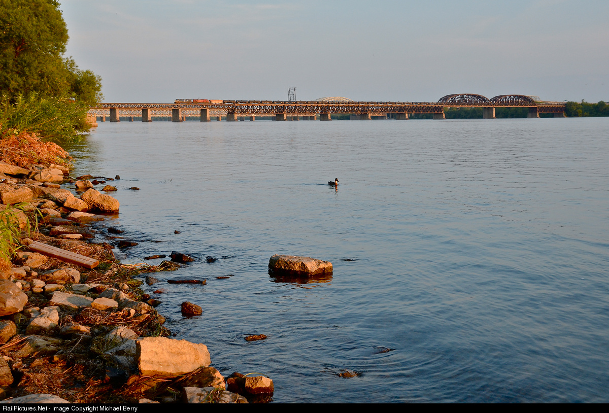 Blue and red cross the mighty St-Lawrence. CEFX 1034 and CP 9841 head over the mighty St-Lawrence river, just a few hundred metres away from Lasalle on the island of Montreal and solid land. They are leading CP 609, an empty oil train that originated in Albany, NY.
