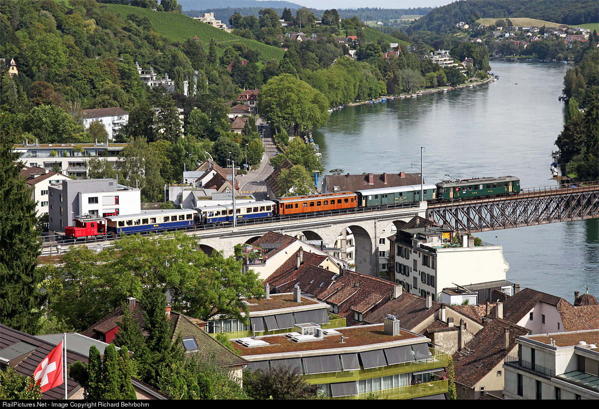 | Former SBB RBe 4/4 railcar is pulling a private charter train across the Rhine Bridge. The Tem 225 043 was needed for shunting the passenger cars on industrial tracks in Zürich. The locos are owned by the association "Verein Depot und Schienenfahrzeuge Koblenz“, the passenger cars by „SEHR“.