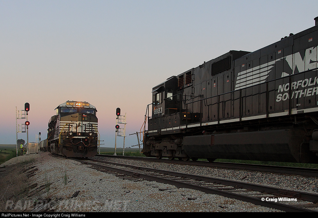 M338's crew is off the power to roll by a G889 into the siding at Jesup. The G889 is pulling in with 2 NS units, M338 has 2 NS units and the CN 5469. Looks like the east some days around the CN Iowa Zone. G889 is bound for Ida Grove, IA, for loading, the 338 is bound for Kirk Yard in Indiana.
