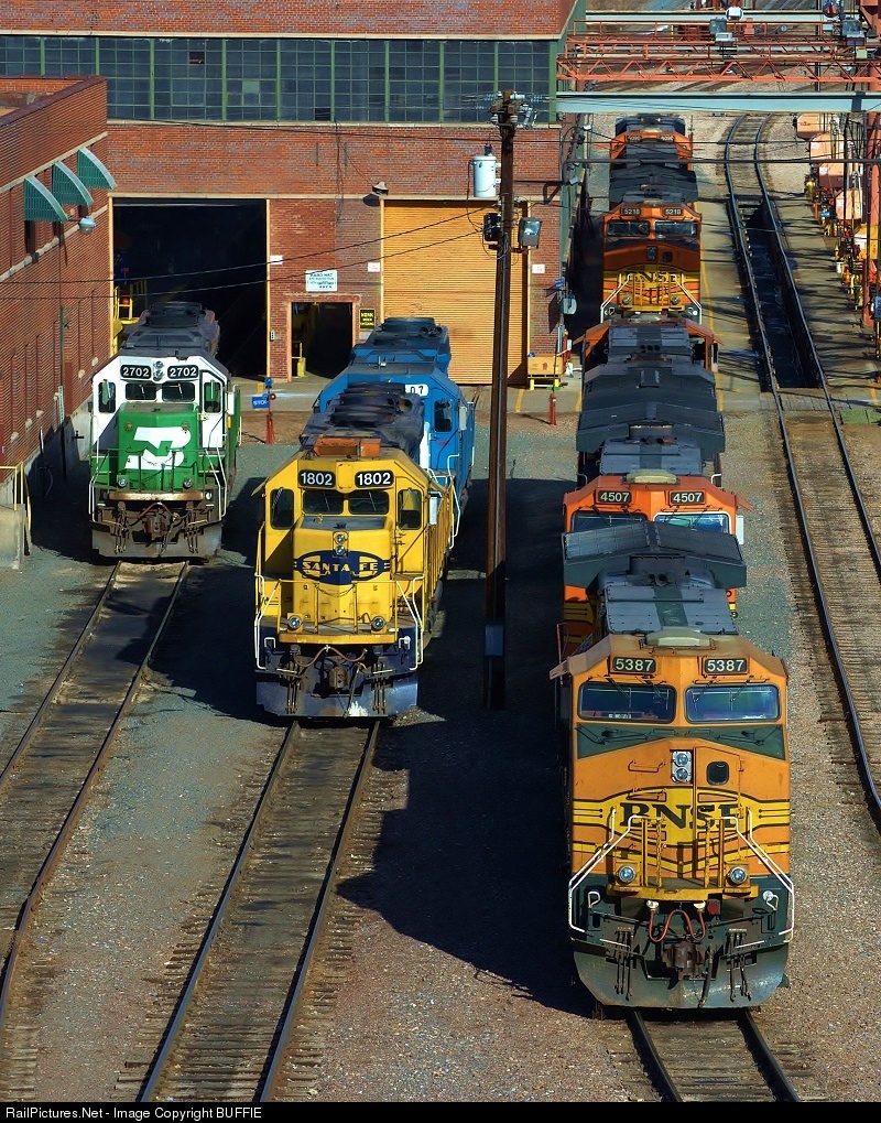 A couple of 'old school' painted light power units (BNSF 1802 is a SD40-2 and BNSF 2702 is a GP39-2) sit next to a line of heavy power units being serviced.
