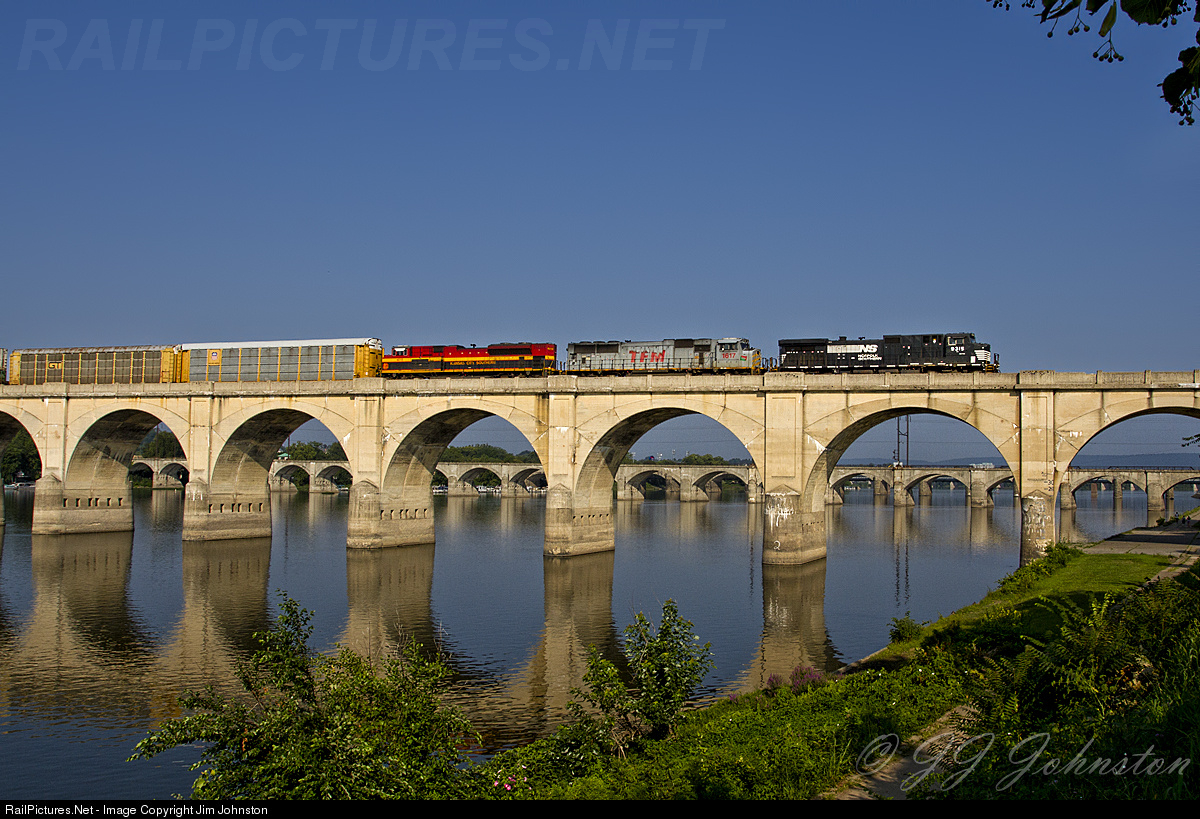 | NS 212 hotshot Atlanta, GA to Croxton, NJ intermodal train crosses the Reading bridge into Harrisburg with the TFM 1612 and KCS 4015 in trail. |