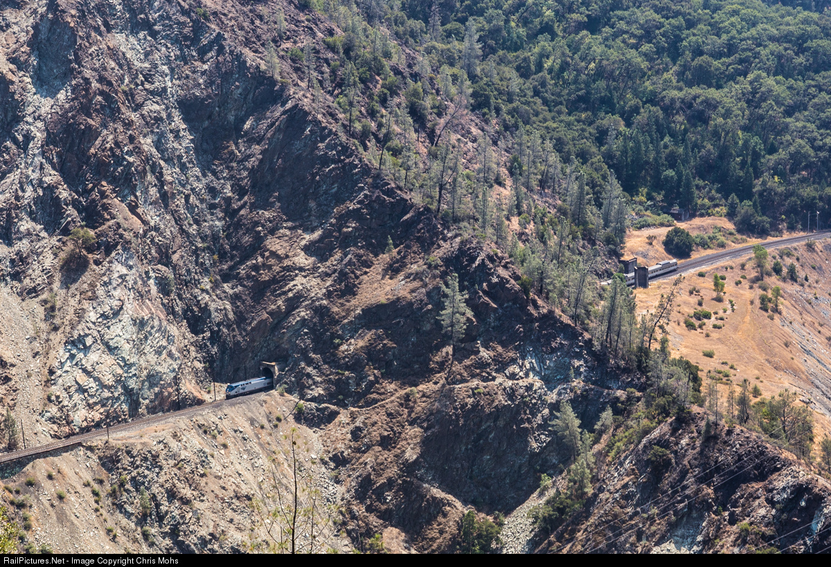 | Amtrak 137 and 203 pull a mix of private cars to Portola Railroad days. The Domes To Portola special has started from Emeryville in the San Francisco Bay Area and is shown passing through tunnel 9 at Poe. There is a lot of smoke in the air with all the fires in California. |
