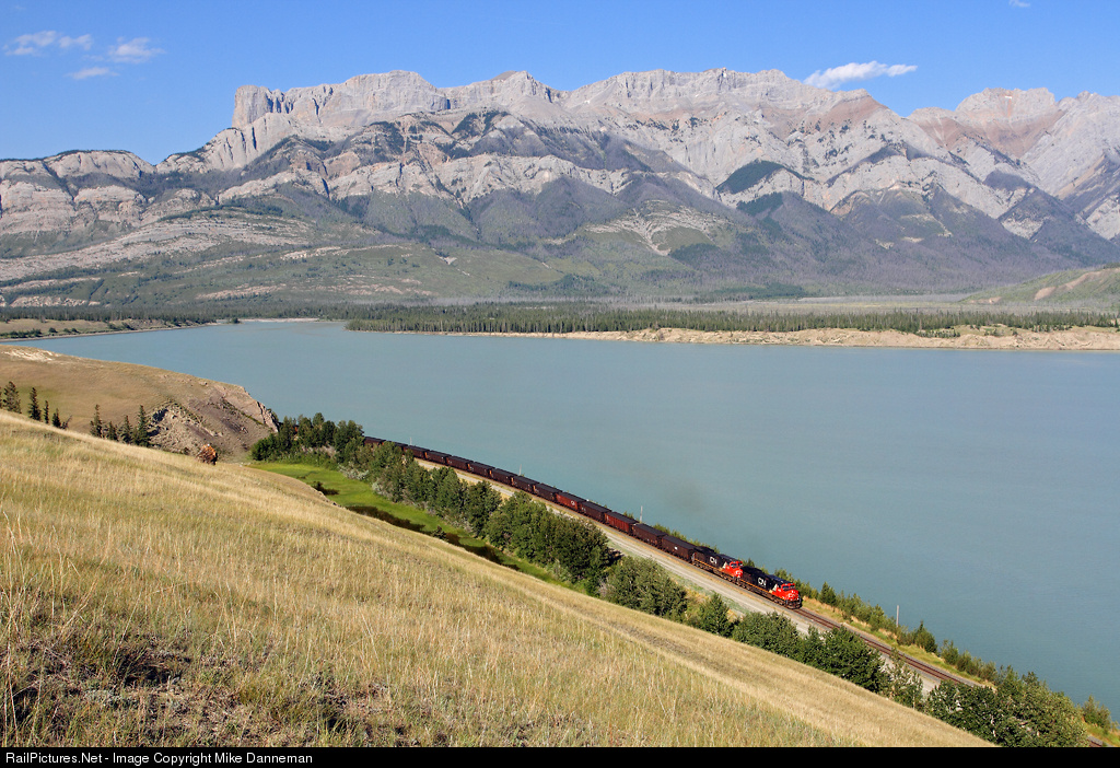 With coal up front, westbound Canadian National manifest train No. 303 is just west of Devona, Alberta, along the shore of scenic Jasper Lake on the afternoon of July 11, 2014.