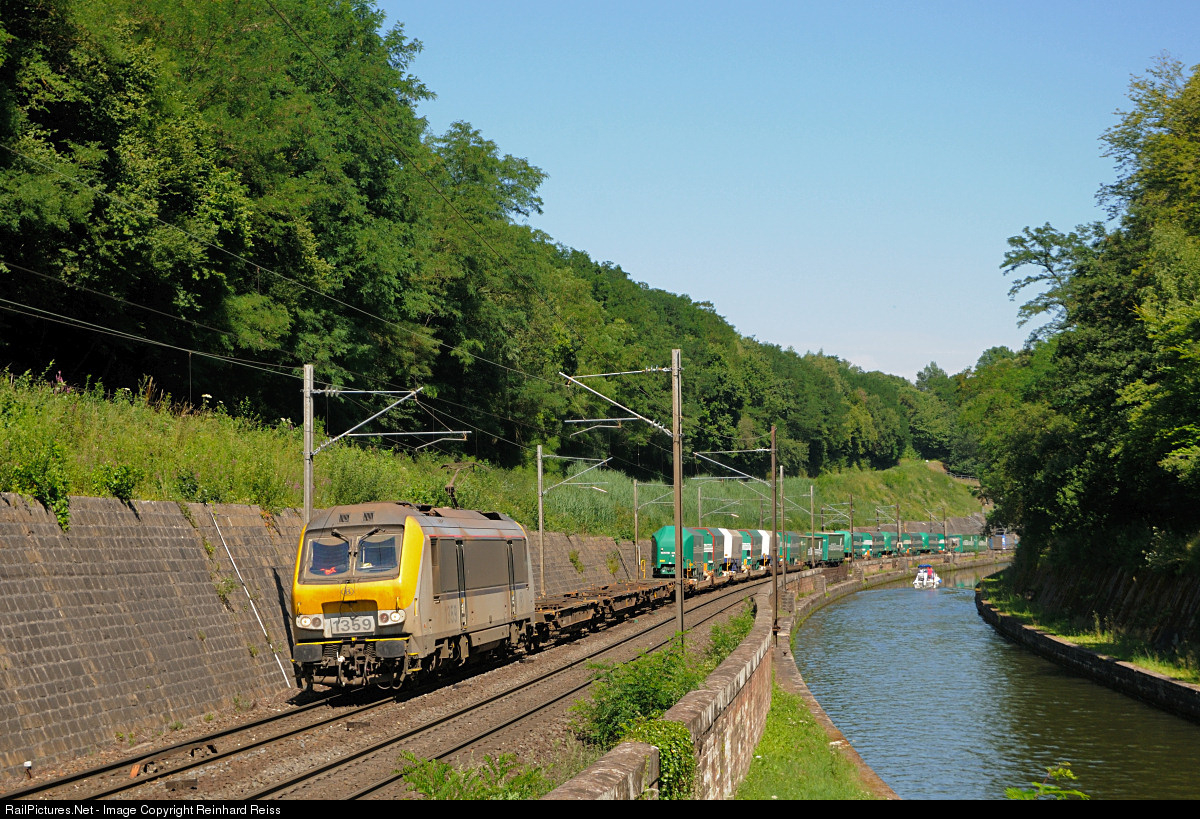 | SNCB Class 13 1359 heads intermodal train 40390 Torino Orbassano - Charleroi Dry Port through the well known Arzviller section on the Strasbourg - Sarrebourg main line. On the right the Rhine - Marne-Channel can be seen |