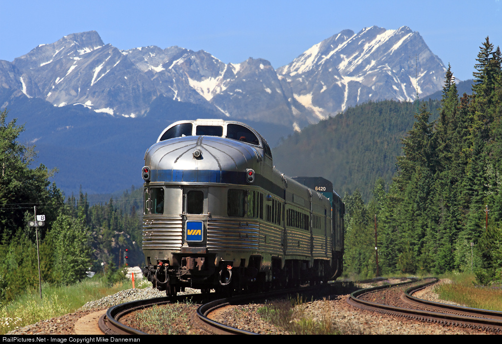 Passing milepost 8 on Canadian National’s Albreda Subdivision, VIA Rail’s train No. 5, the Skeena, has just departed Jasper and is approaching Geikie, Alberta, on July 11, 2014. The westbound vest pocket streamliner powered by EMD F40PH-3 No. 6420 carries dome-observation “Banff Park” on the rear.