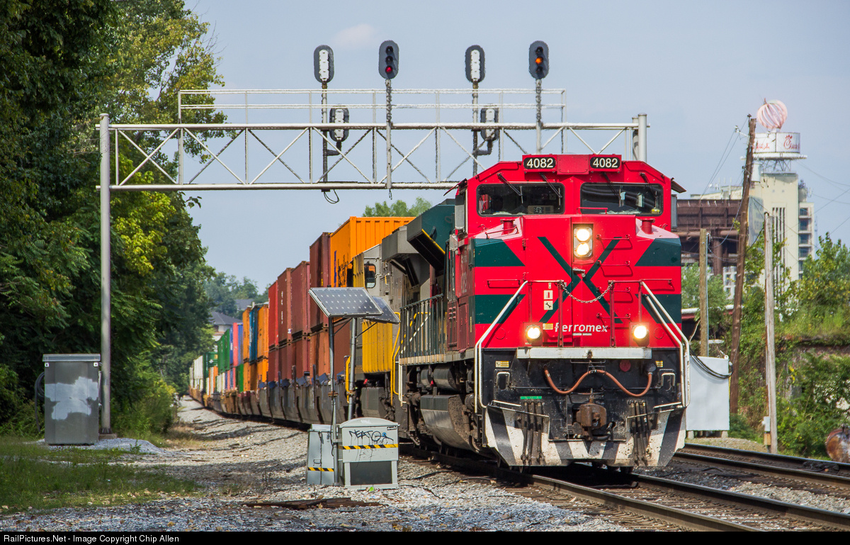 With a consist representing two thirds of North America, NS 221 throttles up at Mecaslin Street in Atlanta for the last few miles of its trip. In the background above the rear of the train is Southern Railway's Brookwood Station, now used by Amtrak, and to the right is one of the many peaches adorning tall towers in Atlanta which represent the towers used to hold the Olympic torch in 1996.
