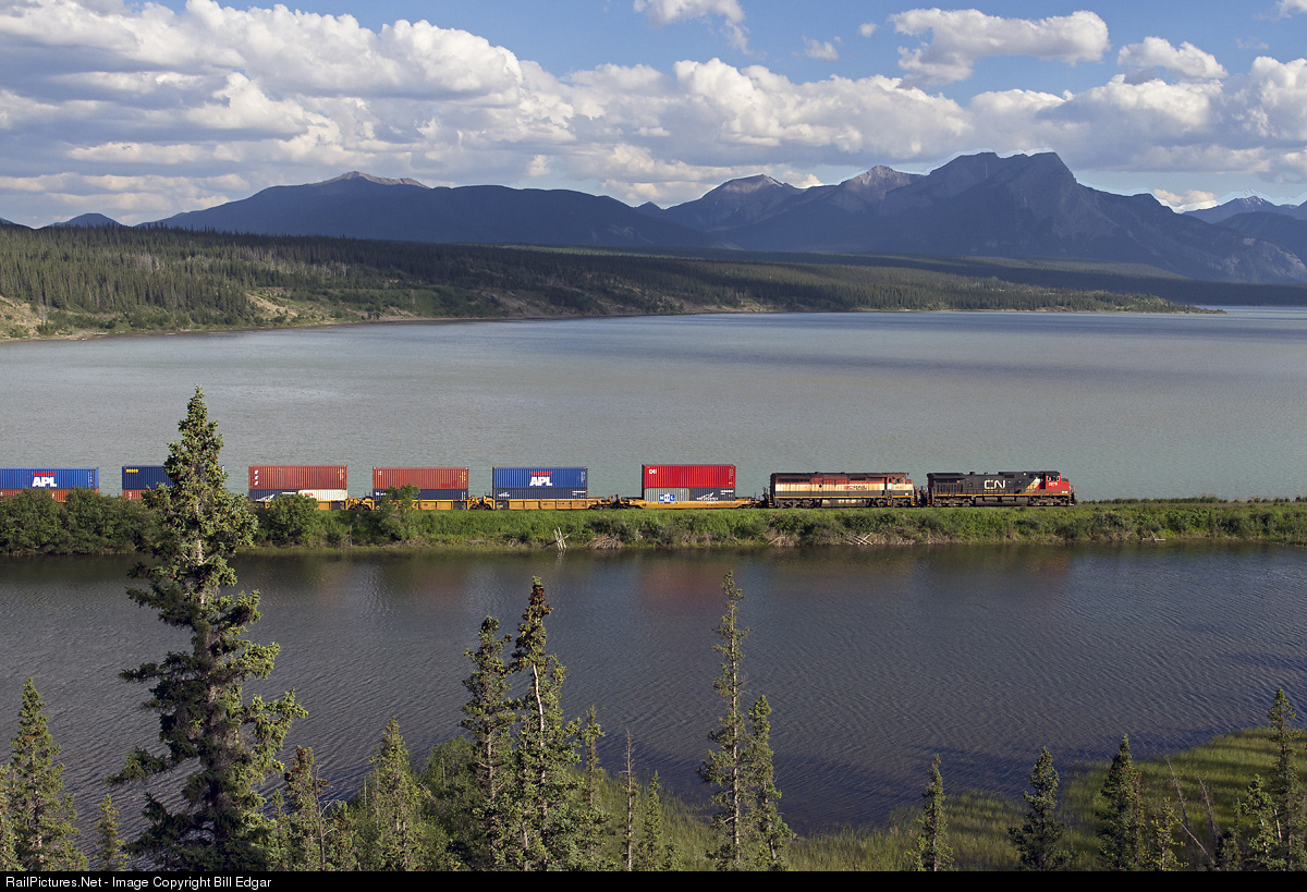 CN train 111 rolls west across the Swan Landing causeway on Brule Lake, just east of Jasper National Park. CN 2678 is paired with former BC Rail 4602 a cowled GE unit. The train also had a DPU on the rear.