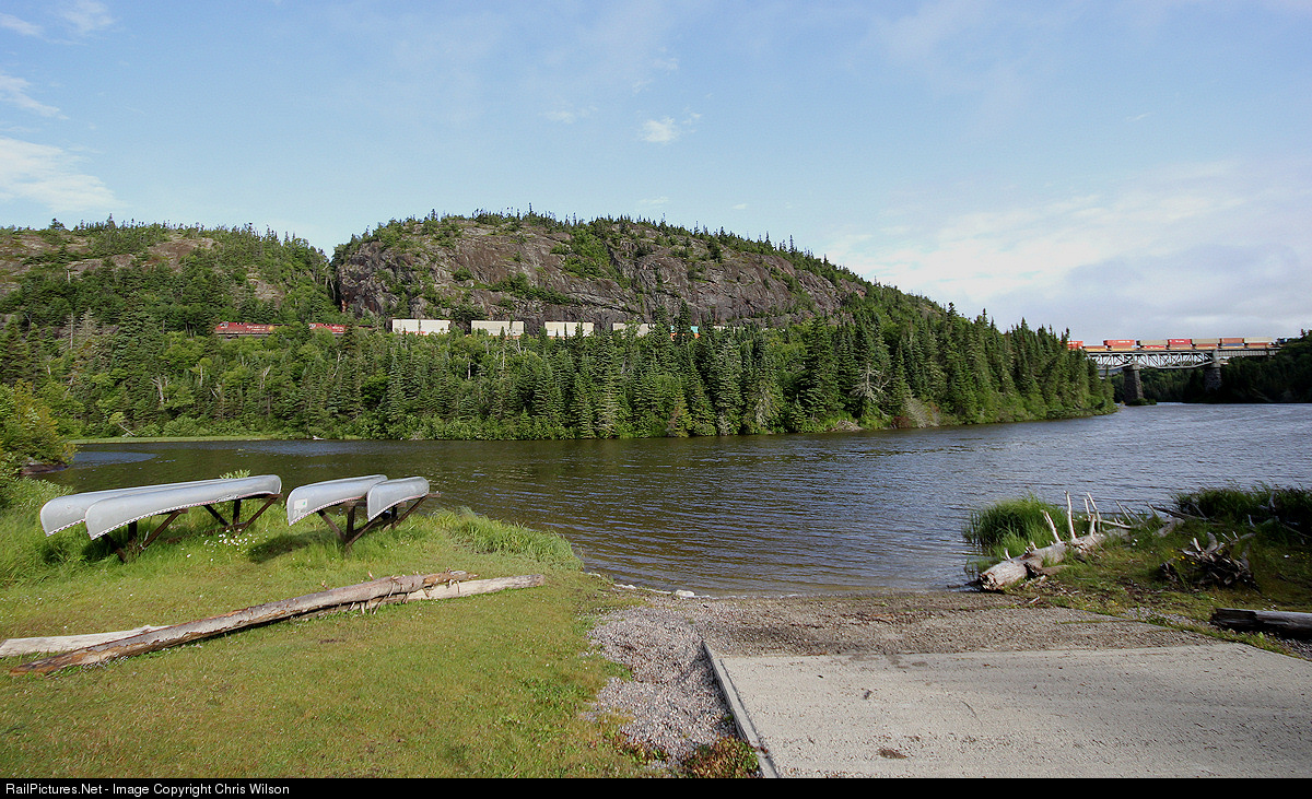 CP 113 heads through Neys Park, across the Little Pic River trestle and along the rocky shoreline. Driftwood dots the rivers edge.