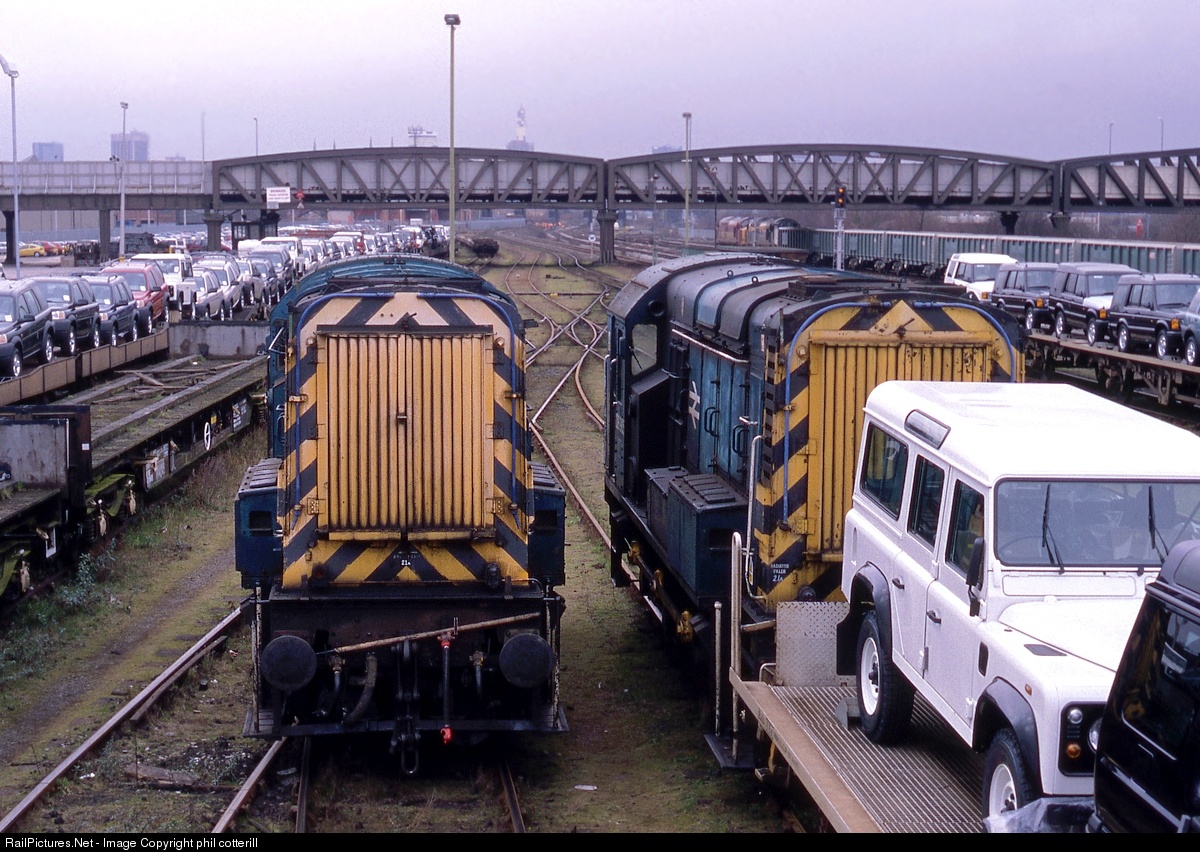 | Shunting locos 08884(left) and 08905 are seen in Bordesley yard in 1999. Cars from the Land Rover factory at Solihull are loaded onto trains here, for export. Note the 2 class 37 locos on a stone train.