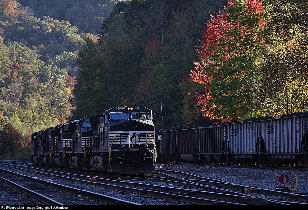 | Early morning light is creeping into the valleys and hollows of WV, showing the blazing Fall foliage. Pushers and loaded Top Gons await crews at Ned, a small yard just outside Gilbert. The loads will go to the Wharncliffe wye, where they'll hit the Pokey main and continue west. |
