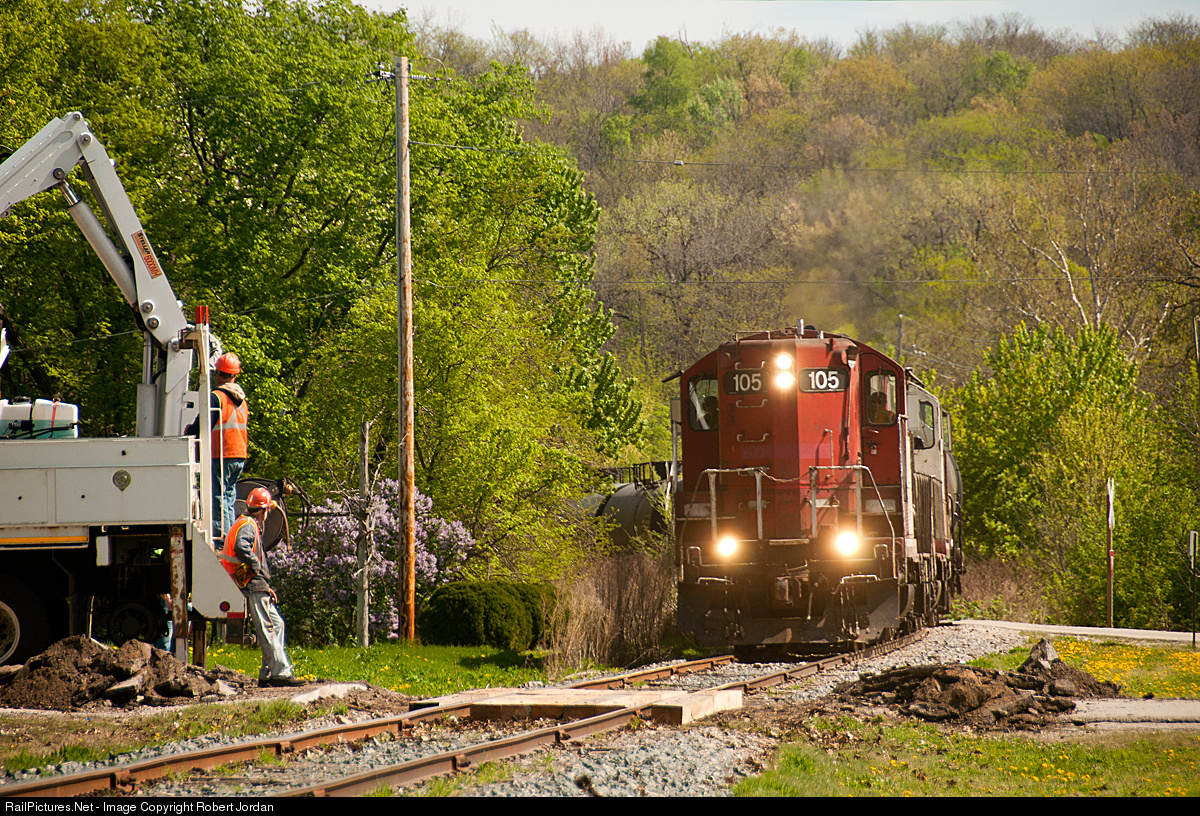 | Canadian Pacific Nitrin Job led by GP 105/103 southbound from Cordova, IL pass MOW crews at Rapids city enroute to Nahant Yard south of Davenport, IA |