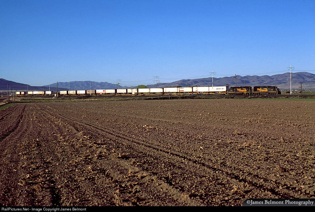 | Rio Grande's Denver to Salt Lake City 'Railblazer' train 103 rolls west through the Salt Lake Valley on April 23, 1987. The Railblazer trains delivered piggyback trailers overnight between the Utah and Colorado capital cities for $299. Check the Google Map in Satellite view to see how much the landscape has changed here in the past 27 years. |
