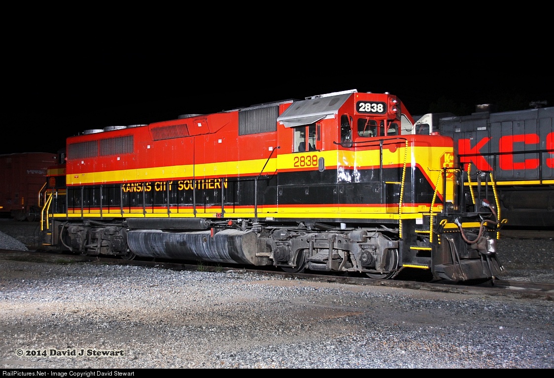Built in September 1968, KCS GP40-2 NÂș2838 began life as PC GP40 3131, to CR 3131 then the unit shipped off to KCS in 1982 to become their 761. In 1991 the unit was sent to MK in Boise, Idaho for a complete rebuild and up graded to GP40-2 specs then returned as the KCS 4791 before being renumbered to 2838 to match the carrier's horsepower based numbering system. It's seen standing at KCS's High Oak Yard in it's colorful Belle scheme in the early morning hours of August 20,2014.