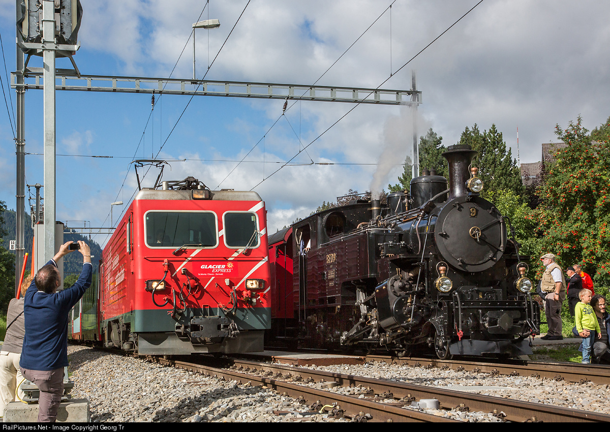| "Glacier Express" GEX 900 from Zermatt to St.Moritz with cogwheel locomotive HGe 4/4 II of the 100 series of the MGB is overtaking steam train from Brig to Oberwald, pulled by HG 3/4 # 9 of the Dampfbahn Furka Bergstrecke, in the station of Lax. The driver of the Glacier Express got a slow order to go through the station because of the many people near the tracks. |