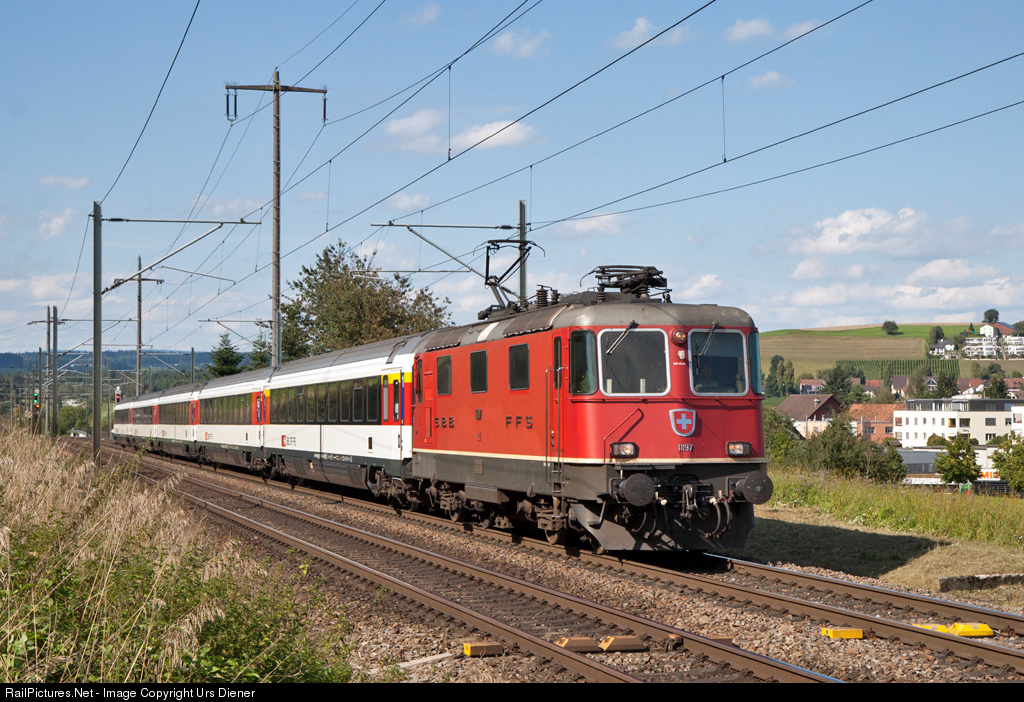 The SBB Re 4/4 II 11197 is leading the intercity 187 on the Swiss part from Stuttgart (Germany) to Zürich (Switzerland).