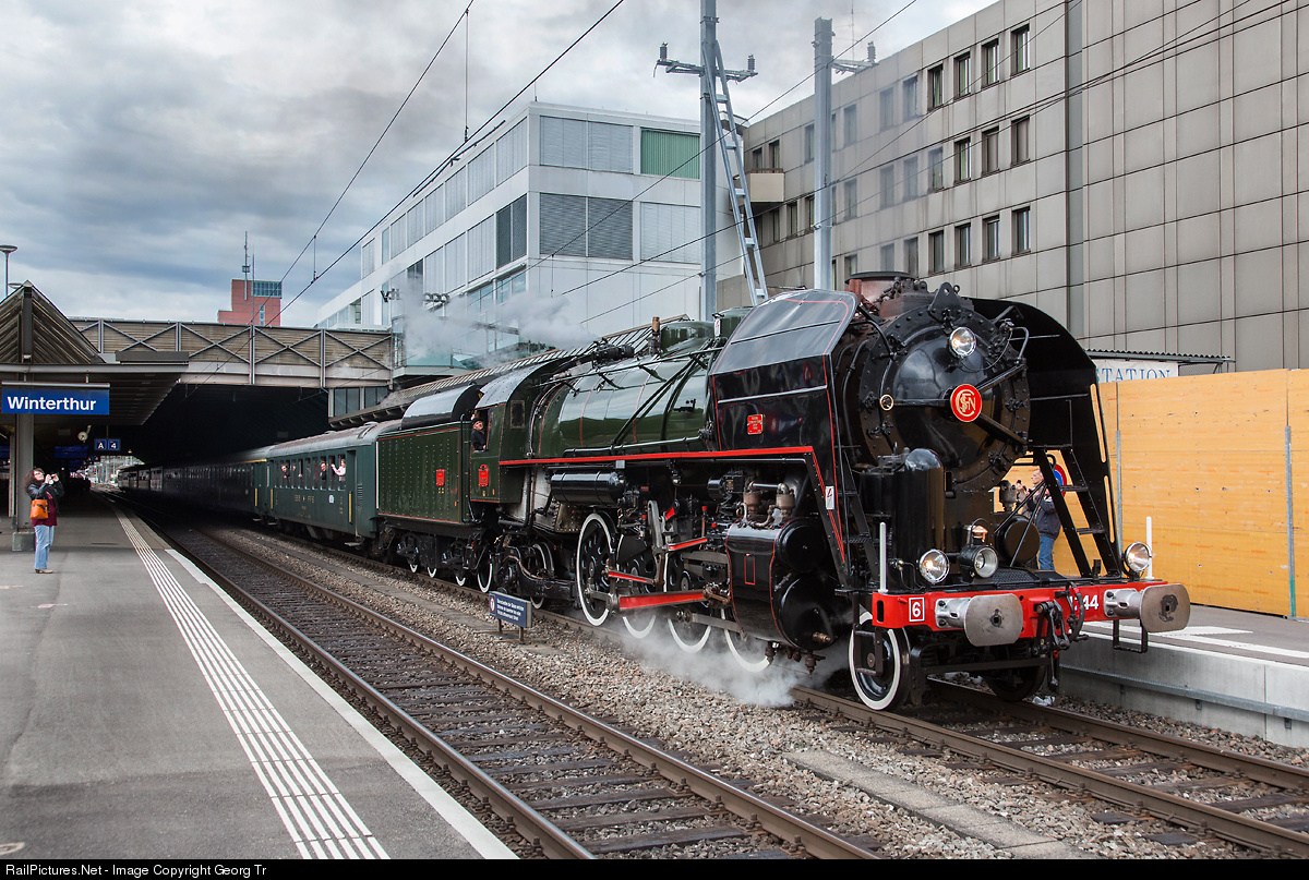 Montreal built "Mikado" 141 R 1244 (2-8-2) of association "Mikado 1244" in Brugg (AG), leaving Winterthur with her typical impressive loud and hard exhaust beats. The 9 car train of 350 tons ran from Brugg (AG) via Baden-Regensdorf-Bülach-Schaffhouse to Stein am Rhein, and back via Kreuzlingen-Romanshorn-Weinfelden-Winterthur-Zürich Altstetten to Brugg (AG).