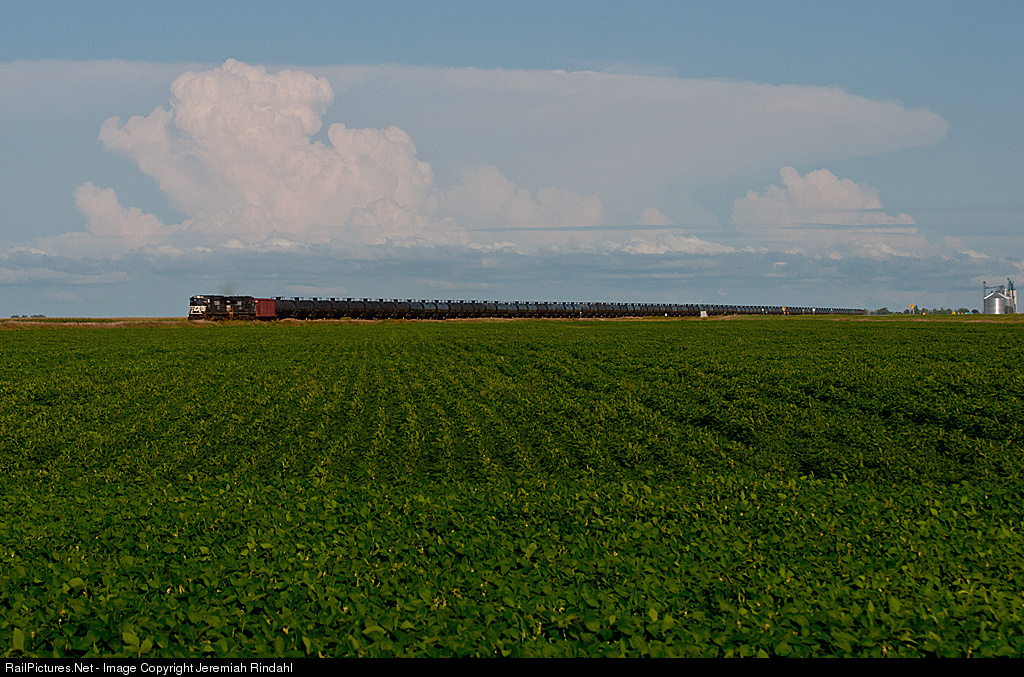 | NS 2582 heads up yet another string of oil cans destined for the oil fields of western North Dakota. The non-existent town of Tenney looms in the background as it traverses the last couple miles of Minnesota soil and soy bean fields. Off in the distance about 150 miles away, severe storms pound the Lake Mille Lacs area and some producing tornadic activity. |