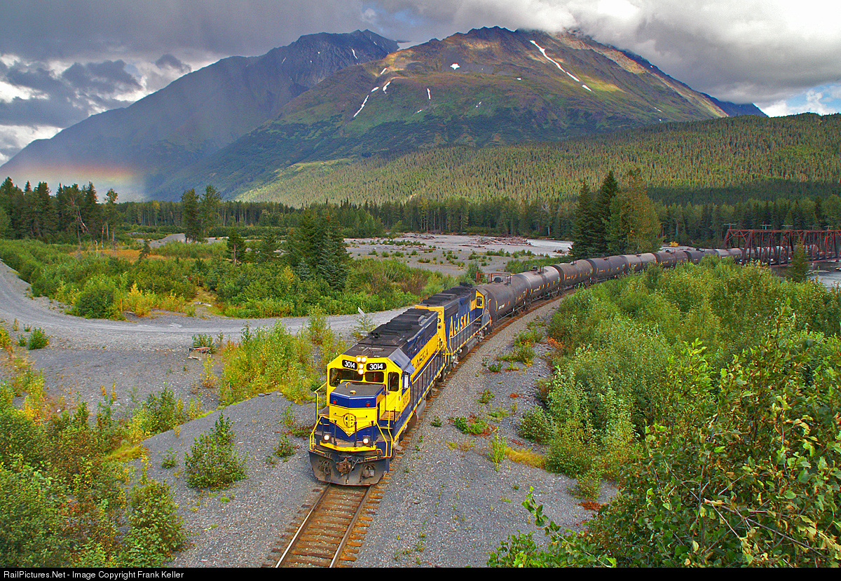 | Two GP40-2s hustle 14 loads of much needed fuel to Seward. When possible the Alaska Railroad will make a special run to accommodate shippers in need of a delivery. In the background is an unusual horizontal rainbow. |