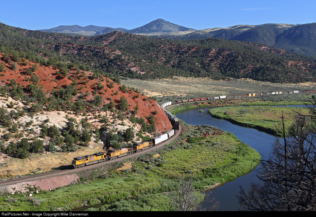 | Along the scenic Colorado River, Union Pacific’s westbound MNYRO freight approaches Yarmony, Colorado, on August, 3, 2014. |