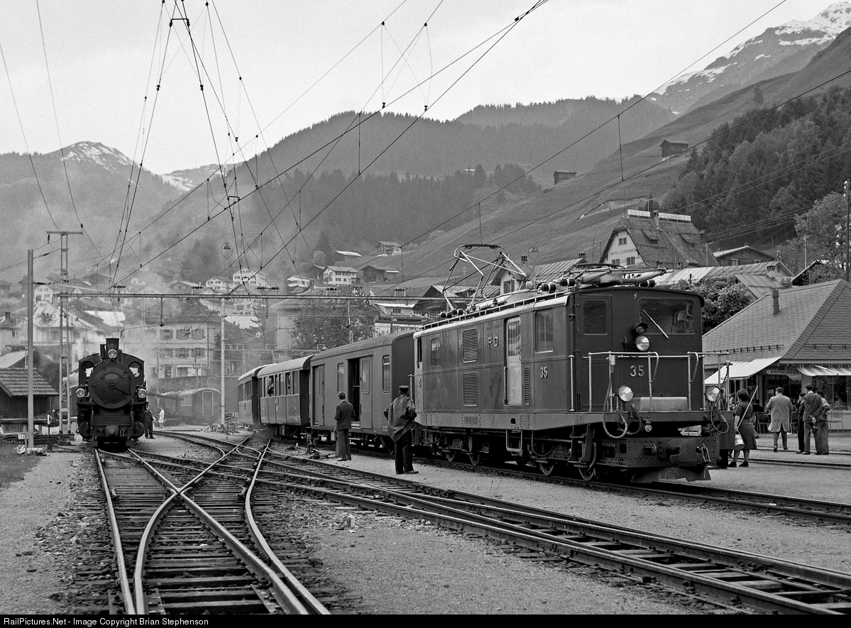 | Furka Oberalp Bahn rack and adhesion electric loco No 35 arrives at Disentis/Muster with the 11.45 Brig to Chur train. Standing on the left is Rhatische Bahn G 4/5 2-8-0 No 108. |