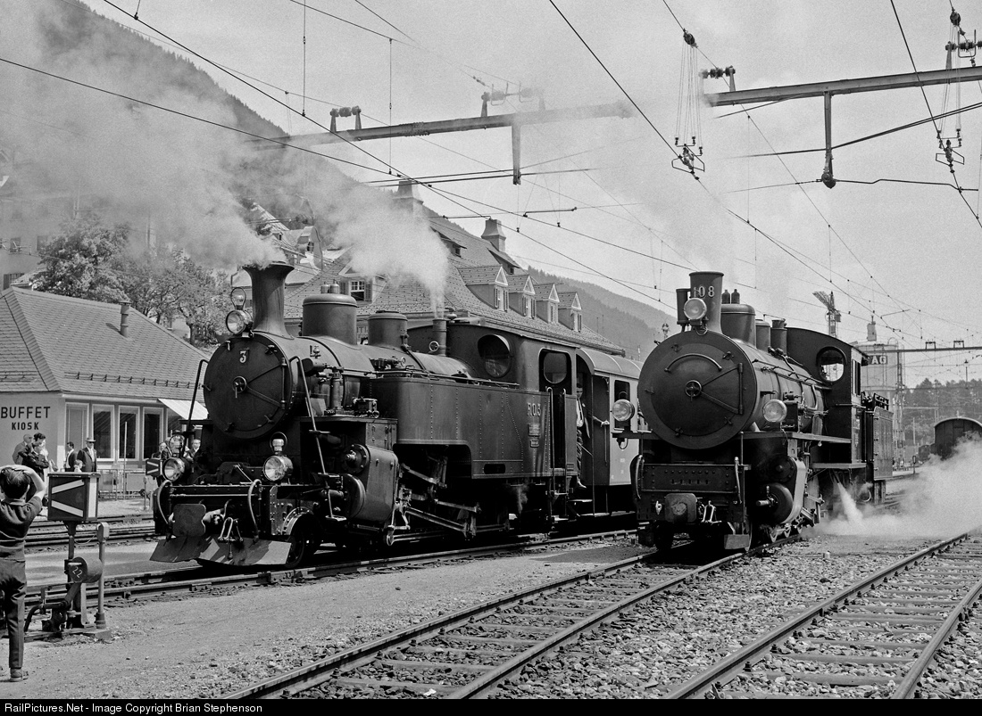 | Furka Oberalp Railway HG 3/4 rack and adhesion 2-6-0T No 3 and Rhatische Bahn G 4/5 2-8-0 No 108 at Disentis/Muster. The 2-8-0 had brought a special train from Landquart and passengers then transferred to another train for the journey behind No 3 to the Oberalp pass summit. |