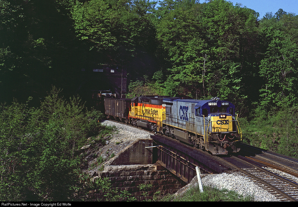 A mixed freight, which appears to have an open auto rack as the second car, blasts out of the east portal of Falls Cut Tunnel and across Wills Creek on its journey towards Cumberland.