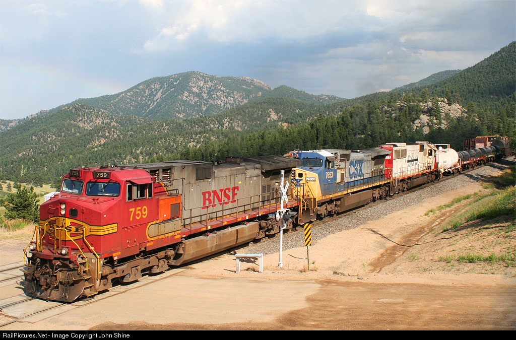 With a rainbow barely visible on the left hand side of the picture, BNSF 759 still in Warbonnet paint leads a CSXT GE and an ex Soo Line SD60 Westbound.