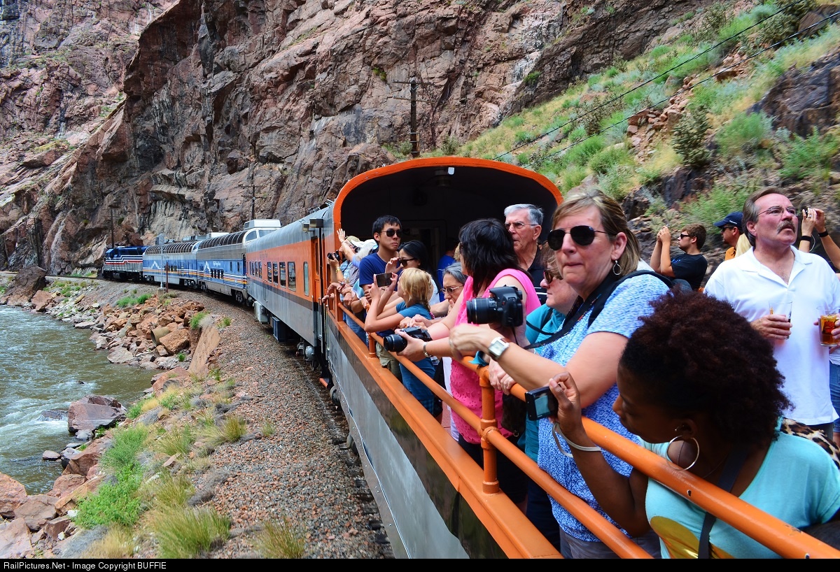 | One of the unique features of the Royal Gorge Railroad is the open cars, allowing passengers to take photos of the wonderful scenery as the train passes through the Royal Gorge on the old Tennessee Pass line. |