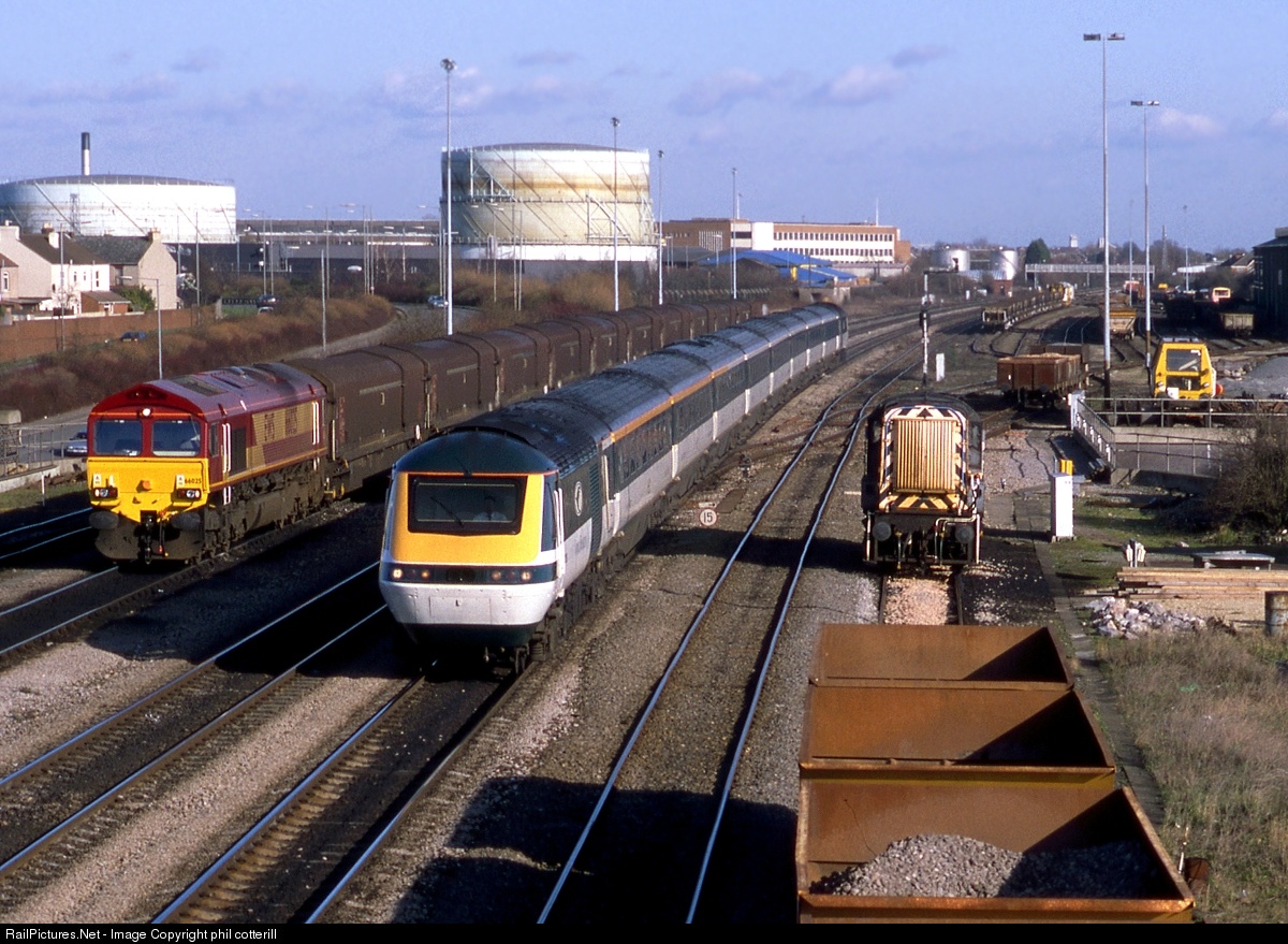 | 66025 was very new in 1999. It is heading a train of Rover car body panels to Longbridge. A GW HST in a short-lived livery passes on a London Paddington to Swansea service. |