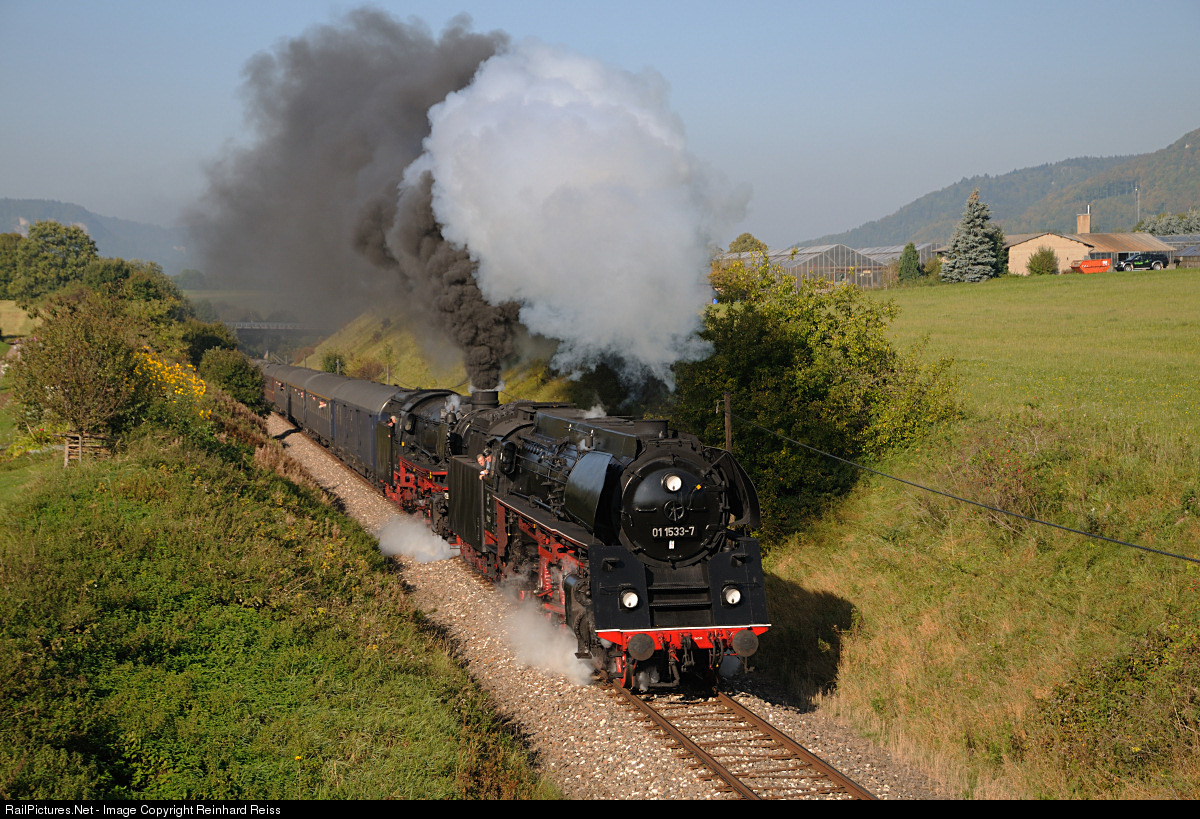 | 01 1533 "Pacific" and 41 018 "Consolidation" heading up the 1:45 slope from Balingen to Ebingen on the Zollernbahn with a charter train. |
