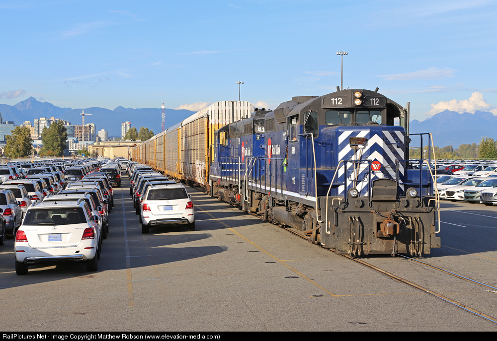 | With automobiles as far as the eye can see, the afternoon rack job pulls a string of loaded auto racks out of the Wallenius Wilhelmsen Logistics compound. WWL is one of the largest auto compounds on Canada's west coast, and Southern Railway of BC's largest customers. |
