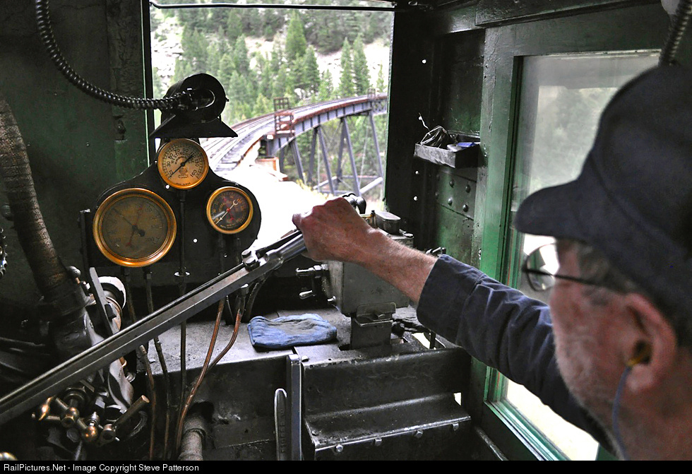 Engineer Charles slackens the throttle on Shay No. 9 on Colorado’s Georgetown Loop RR as it approaches the high bridge which has a speed restriction.
