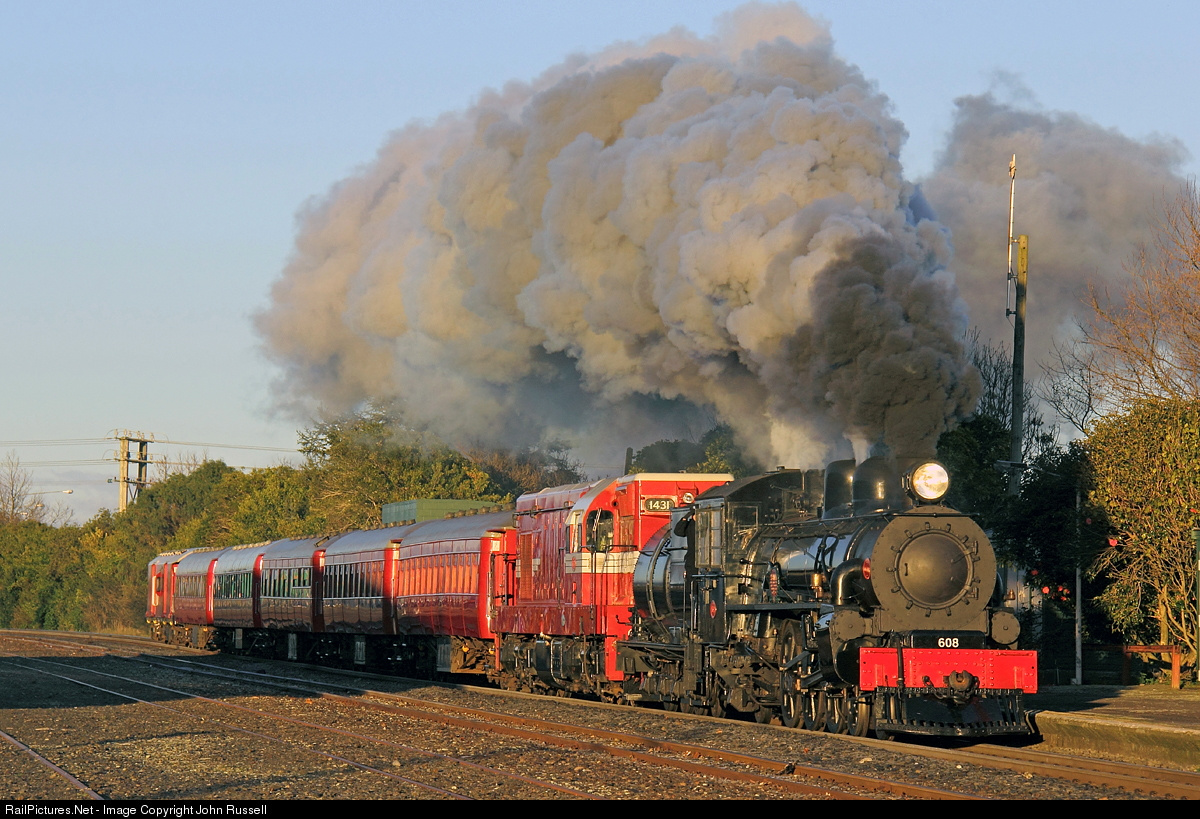 | Ab 608 was built by NZR Addington (Christchurch) in 1915 and named "Passchendaele" in 1925 as a War Memorial for the fallen in that horrendous battle of WW1. It is now owned by NZ Railway & Locomotive Society who restored it for the centenary. On loan to Steam Incorporated, this was the first excursion after restoration. Assisting is DA 1431 (EMD G12A) built by Clyde Engineering in NSW in 1957 for NZ Railways. It was sold to Steam Incorporated in 1988. The train is making a passenger stop at Levin prior to Ab 608 being taken off for servicing at Palmerston North. |