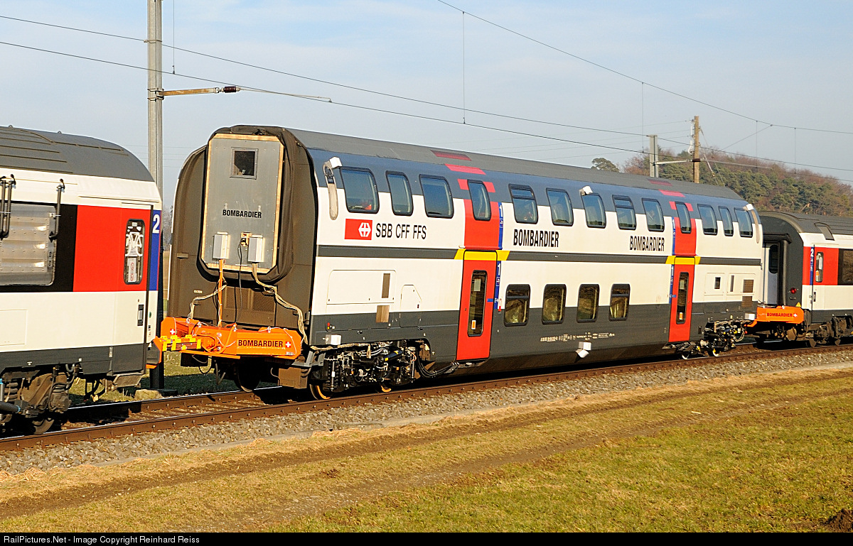 | Doubledeck IC2000 car equipped with WAKO, the FLEXX Tronic Roll-Compensation developed by Bombardier, on a test run at the Seuzach - Etzwilen-line near Ossingen. |