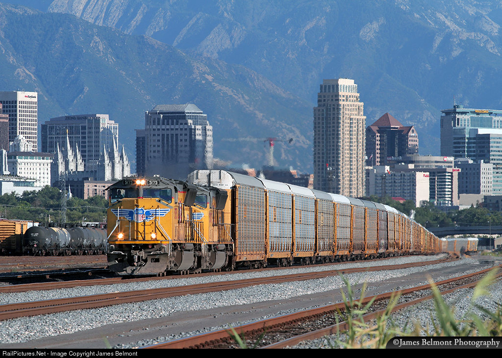 A 7572 ft. autorack train departs Salt Lake City with 75 empties for the Norfolk Southern in Kansas City. Aug. 31, 2014