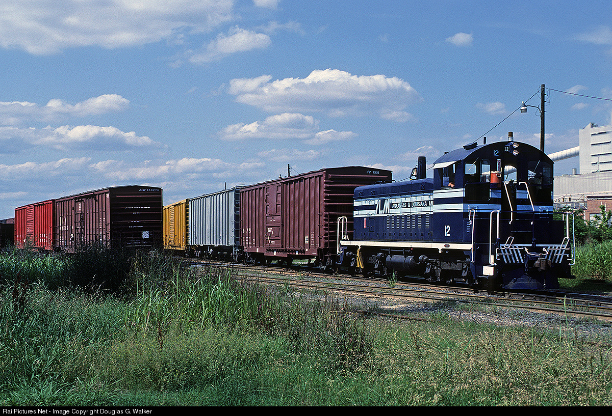 Arkansas Louisiana & Missouri SW9 12 switches cars to make up a train in Bastrop, Louisiana, on June 1st, 1983. This engine was built for the AL&M by EMD in January 1952, and would eventually end up being sold to Georgia's Chattahoochee Industrial Railroad as their number 12.