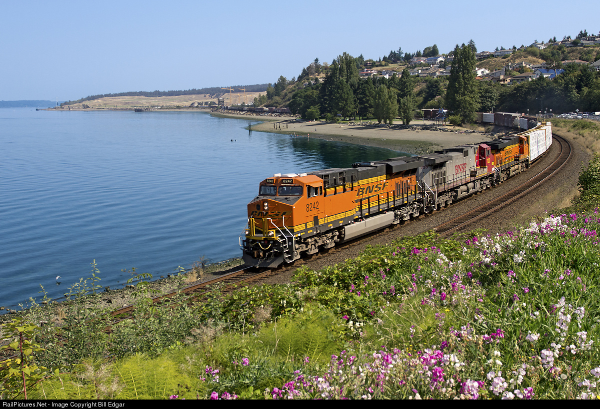 | BNSF 8242 leads a manifest consisting mostly of Canadian forest products south along the shore of Puget Sound at Steilcoom, just south of Tacoma, WA. This line sees plenty of traffic from BNSF, UP and Amtrak. Future plans will re-route Amtrak away from this waterfront line which is the most scenic part of the Seattle/Portland train ride. |
