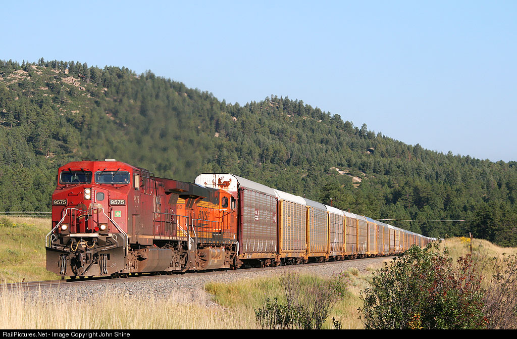 CP 9575 leads this Big Lift, CO to Kansas City empty BNSF Autorack train South down the Joint Line.