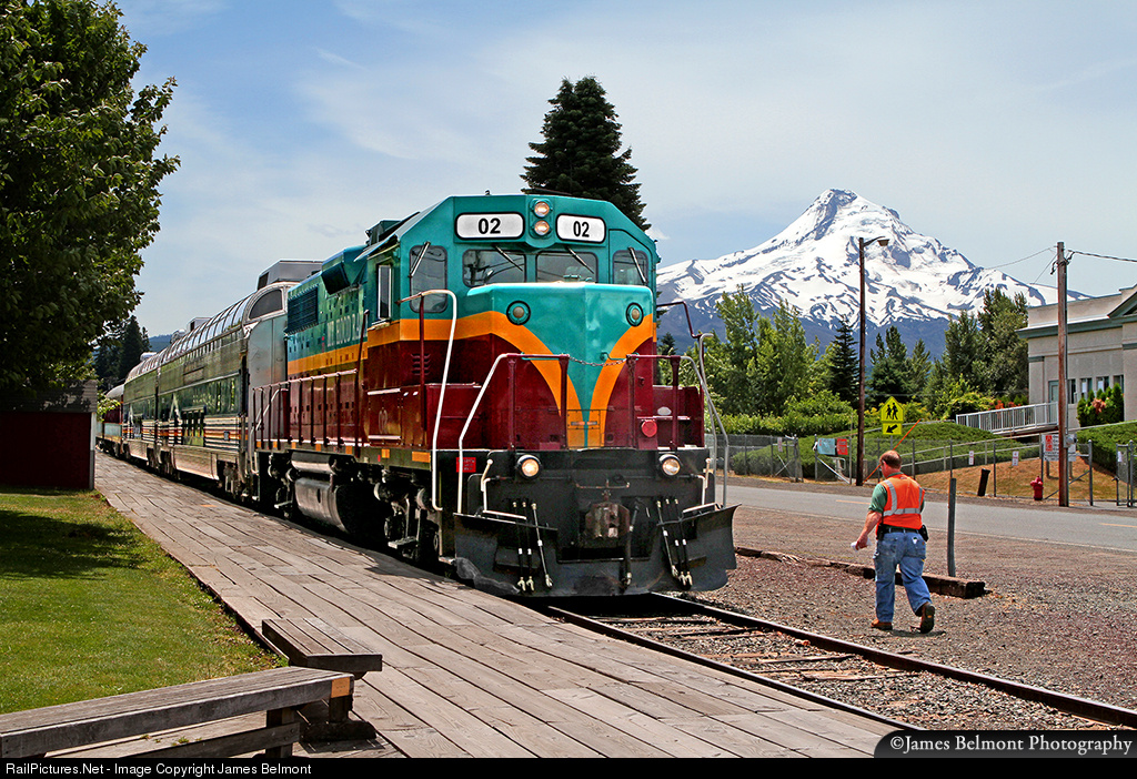 With its 11,250 ft. namesake peak looming in the distance, a Mount Hood Railroad dinner train readies for departure from Parkdale for the 21 mile journey home to Hood River, Oregon. July 3, 2014