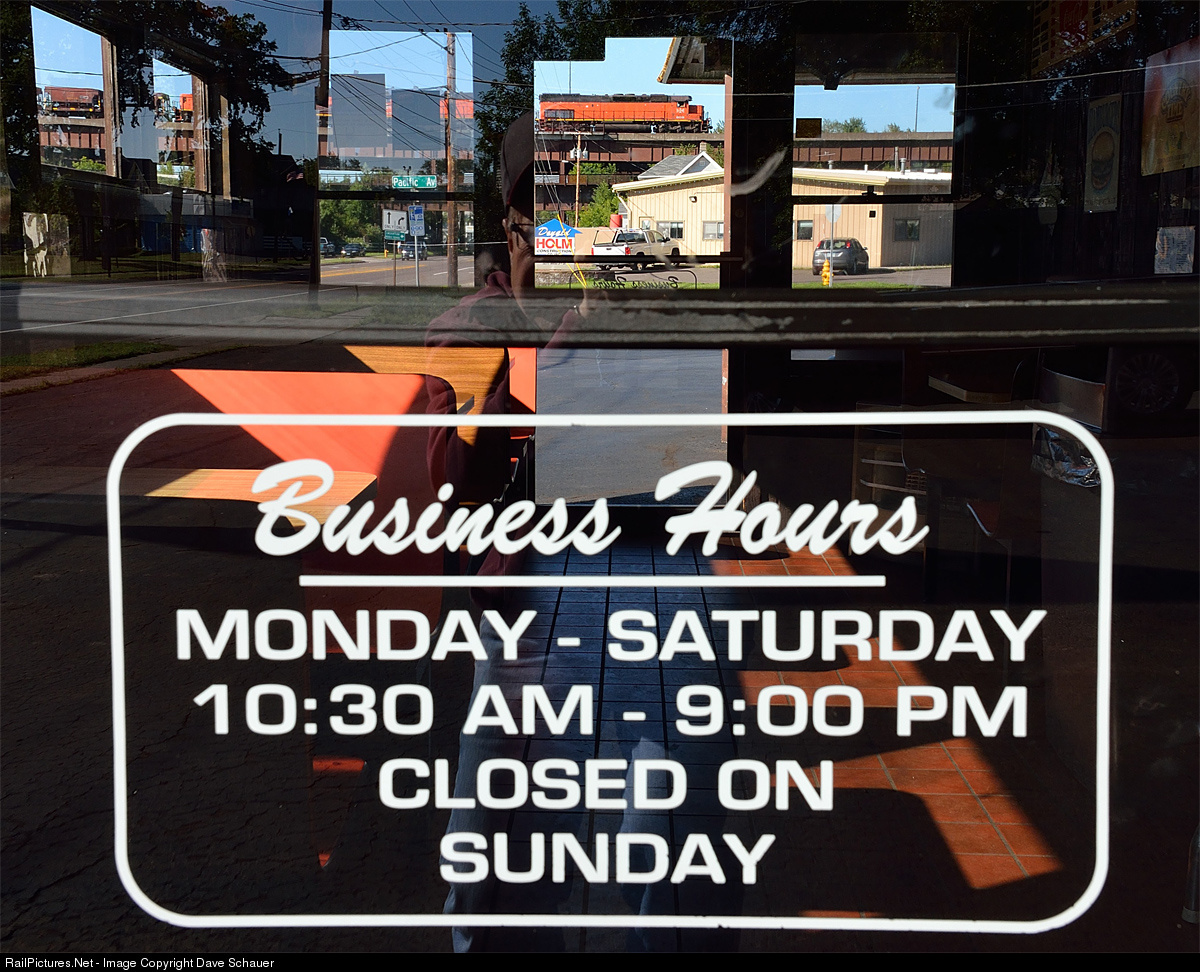 | A & Dub's drive-in wasn't open yet so I couldn't order my favorite Hunter Burger, but their orange seating fit right in with the trio of Bessemer 900s working on the approach to CN's Duluth ore dock. The window reflection almost made this an unintended self portrait. |
