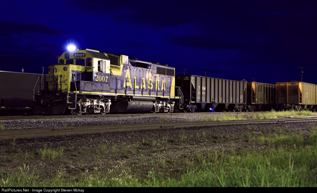 2007 switches coal loads and empties at the east end of the yard in Fairbanks. Coal is still the main source of power in this part of Alaska with several power plants in the Fairbanks area.